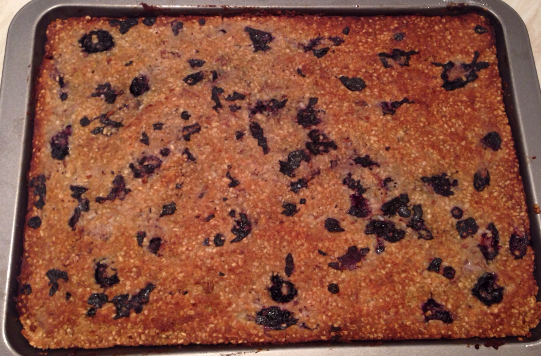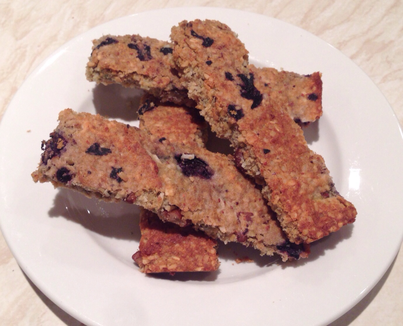 Melt butter and coconut oil. Warm blueberries. Mix all the dry ingredients, add fruit and nuts, mix egg and butter together and then add to the mixture. Stir well. Spread evenly over a non-stick baking tray.
