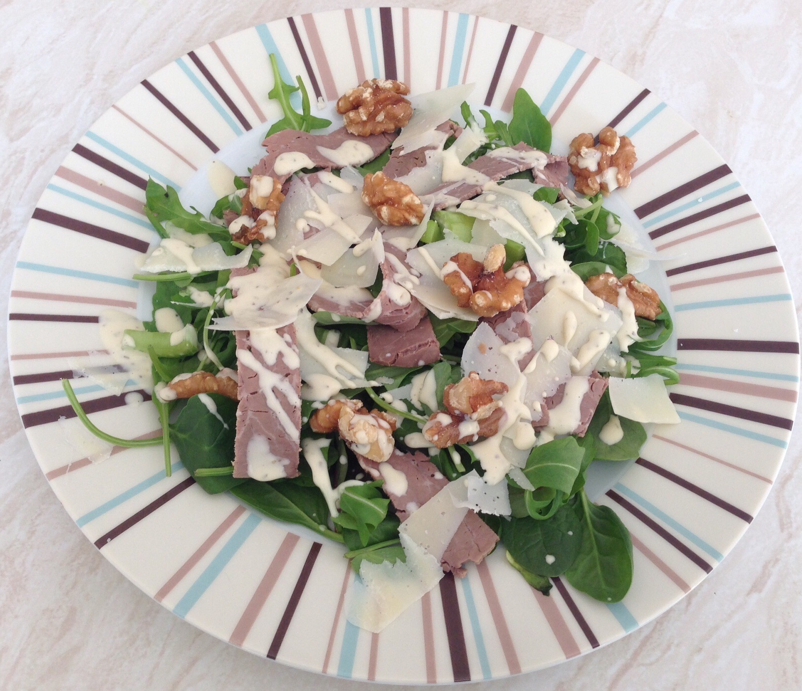 Thinly cut roast beef, shredded parmesan, walnuts with spinach and rocket salad. Add some low carb dressing like the Waitrose caesar dressing, Ranch dressing or Pizza Express house dressing.