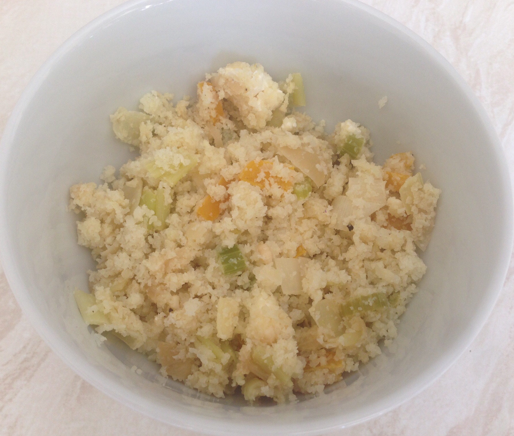 Add a cube of butter, salt and pepper to cauliflower and stir in onion, leek and pepper and microwave for 2 more mins. Stir in the feta and serve.