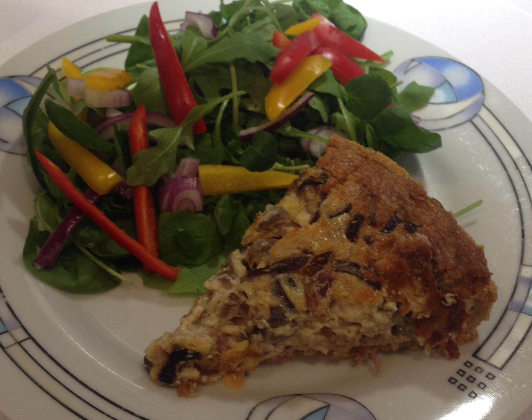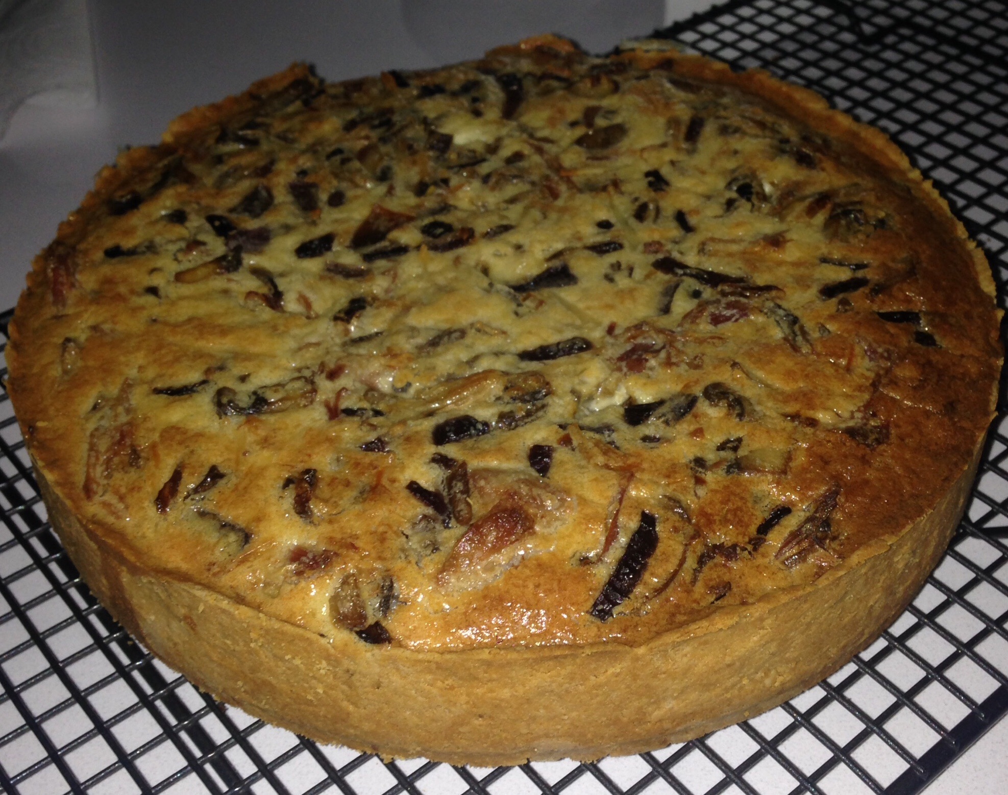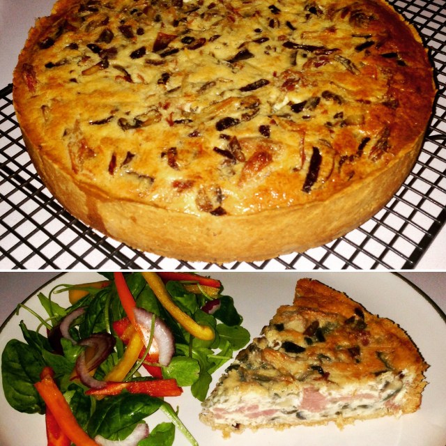 Heat onions, leeks, mushrooms in pan until completely soft, whisk eggs and cream together and add onions, leeks, mushrooms, gamon and cheese and stir well. Spoon into pastry base and return to the oven for around 30-40 mins until filling has set. Cover with foil towards the end of cooking if pastry looks like it may burn.