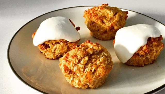 Preheat oven to 180. Combine all dry ingredients. Mix in carrot, orange, half cup of coconut cream and egg yolks, fold in egg whites, spoon into muffin cases and bake for 20-30 minutes.