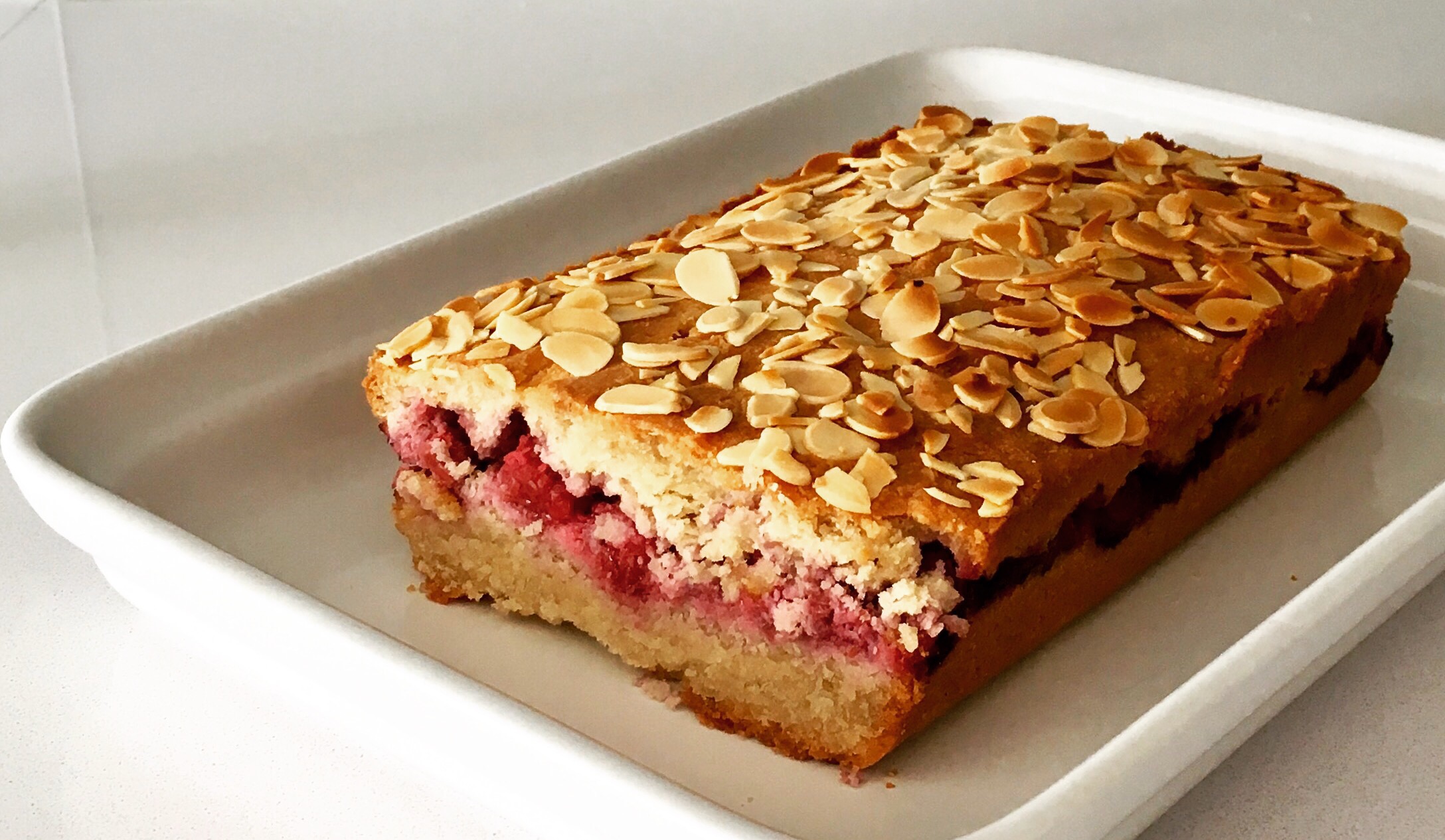 Line a loaf tin with baking paper. Press half the mix into the bottom of the loaf tin, cover with raspberries or any other berry you fancy then press the remaining mix on top of the raspberries and sprinkle the flaked almonds in top. Bake in the oven for 50 minutes.