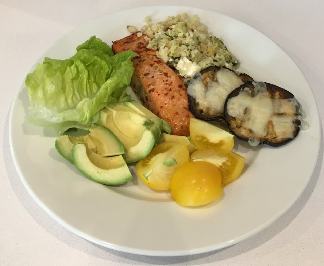 Super Salad! Poached salmon fillet seasoned with chilli. Cauliflower couscous with courgette, leek, feta and pine nuts. Roasted aubergine slices with melted parmasan. Little gem lettuce, tomatoes and avocado. Share this: Click to share on X (Opens in new window) X Click to share on Facebook (Opens in new window) Facebook Like Loading... Related