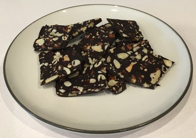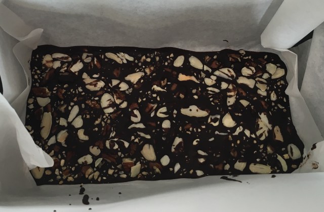 Pour into a tin lined with baking paper. Scatter your toppings, I used pecans, hazelnuts and toasted almonds here.