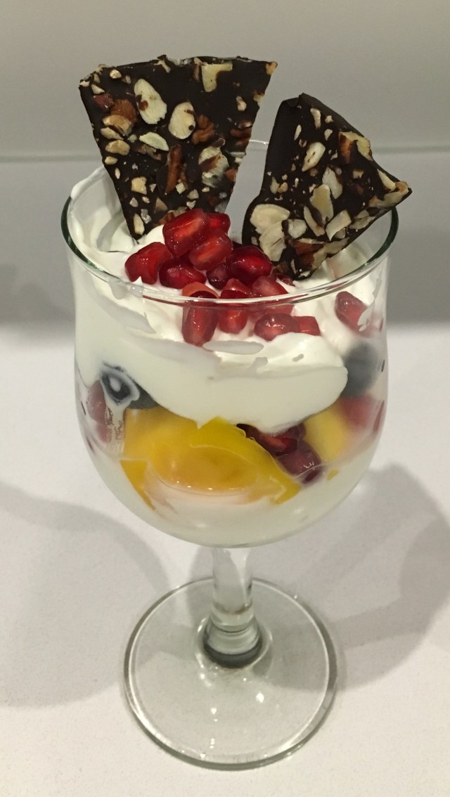 I used Total full fat Greek yoghurt at the bottom followed by blueberries, pomegranate and 3 chunks of mango (keep mango to a minimum as the sugar content is higher than other fruits). You can use any of the low sugar fruits – blackberries, strawberries and raspberries would be perfect. On top some more yoghurt and some of the choc and nut thins.