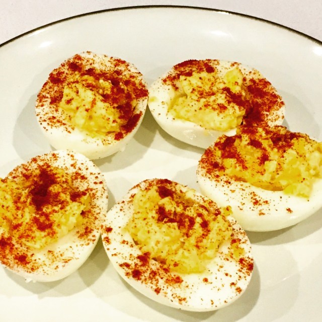 Devilled Eggs! Best accompaniment for a salad. Hard boil eggs, peal off shell and halve, scoop yolks into a bowl, mix with mayo and Dijon mustard. Spoon back into the whites and sprinkle with paprika. Share this: Click to share on X (Opens in new window) X Click to share on Facebook (Opens in new window) Facebook Like Loading... Related