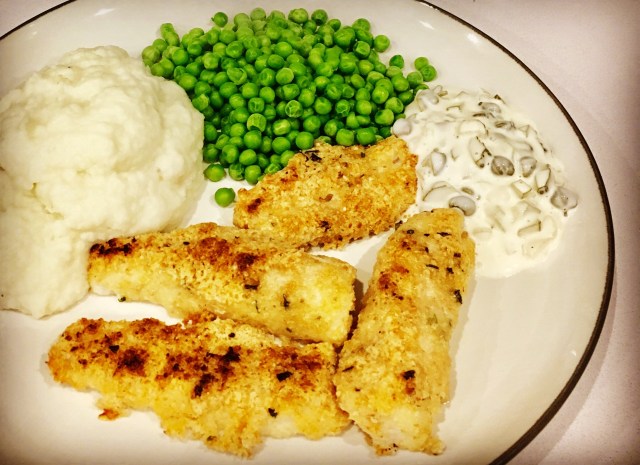 Cut cod loin or salmon fillet into chunky strips, dip in coconut oil then in dry mix and lay on a non-stick baking tray.